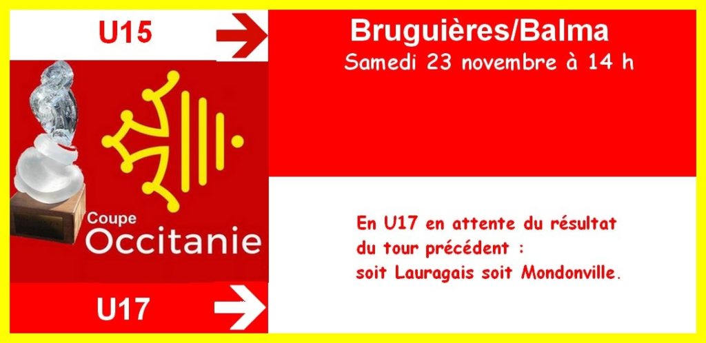 - En U15, entrée en piste de nos joueurs dans le 3ème tour de la coupe d’Occitanie. Ils se déplaceront ce week-end à Bruguières dont l’équipe évolue en D1.