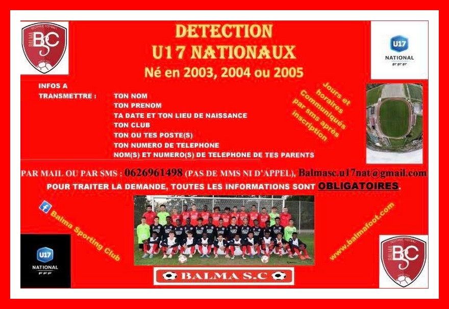 Pour pouvoir participer aux détections des U17 nationaux, une pré-inscription par SMS (pas de MMS ni d’appel) au 06-26-96-14-98 ou par email à l’adresse suivante Balmasc.u17nat@gmail.com est obligatoire.