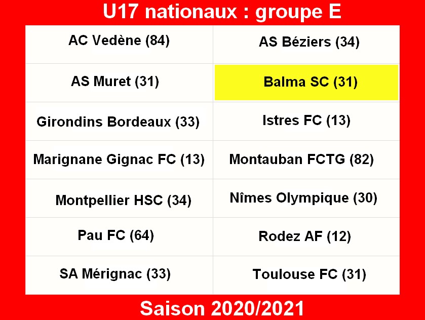 Le groupe E auquel appartient Balma est composé d’équipes du Sud de la France dont plusieurs d’Occitanie (8 équipes sur 14). La ville la plus éloignée de la notre étant Marignane avec 387 kilomètres, la plus proche Toulouse 7 km (entre nos stades respectifs).