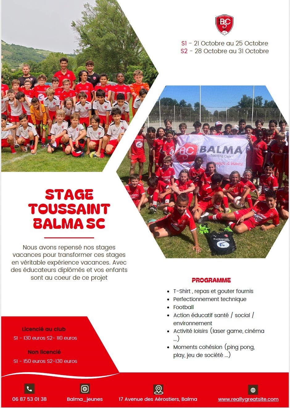 Rendez-vous sur les deux semaines de vacances de la Toussaint pour venir au stage organisé par la Balma SC avec au programme du football et des séances de perfectionnement mais aussi des activités et des super moments de cohésion !