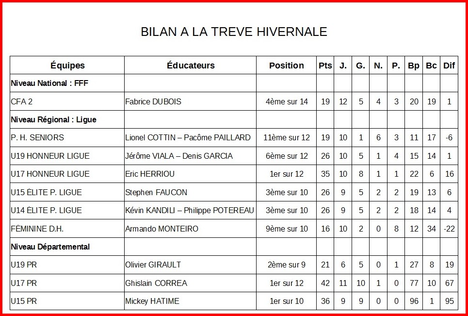 Alors que joueurs et éducateurs prennent des vacances sportives bien méritées, faisons un premier bilan des résultats et classements de nos équipes.
