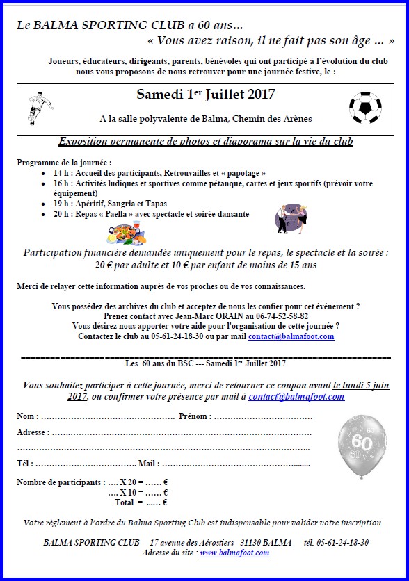Le samedi 1er juillet prochain, le Balma Sporting Club fêtera ses 60 ans.