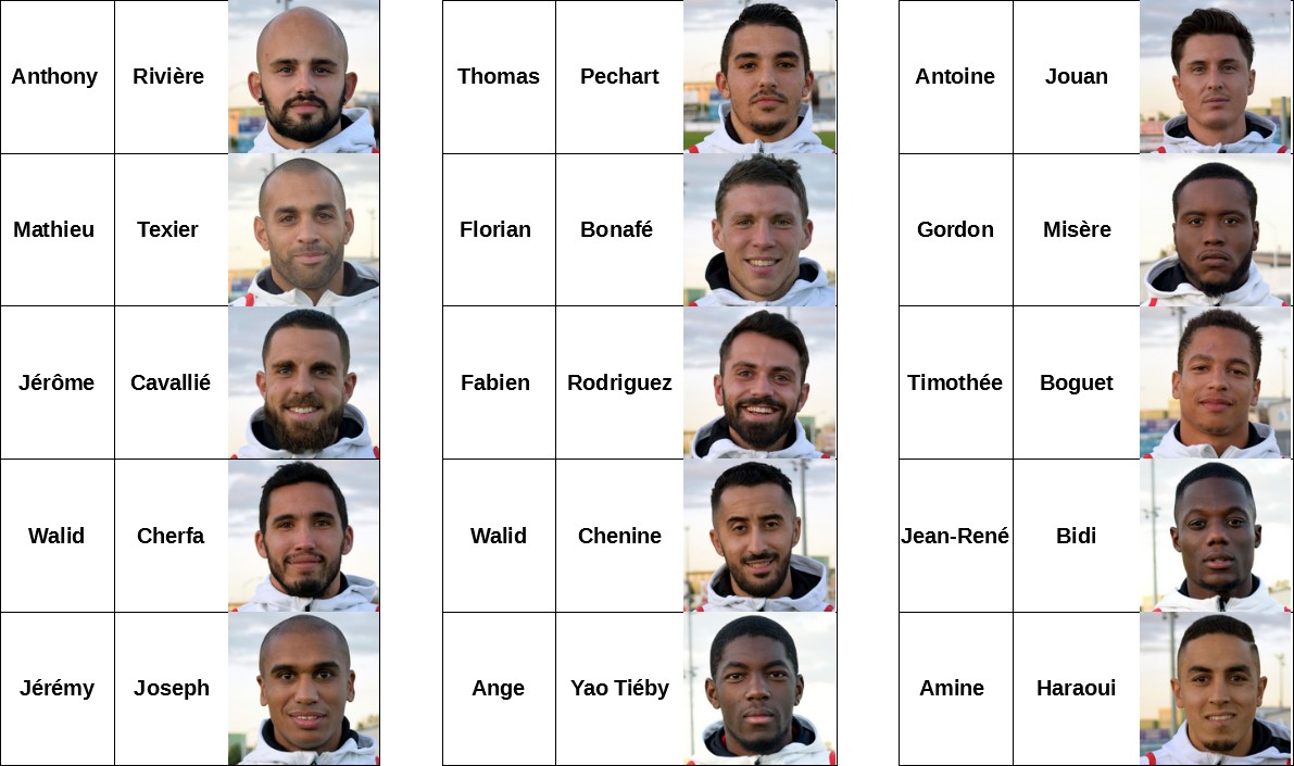 Le groupe retenu par Fabrice Dubois : Rivière – Texier – Cavallié – Cherfa – Joseph – Pechart – Bonafé – Rodriguez – Chenine – Yao Tieby – Jouan – Misère – Boguet – Bidi – Haraoui .