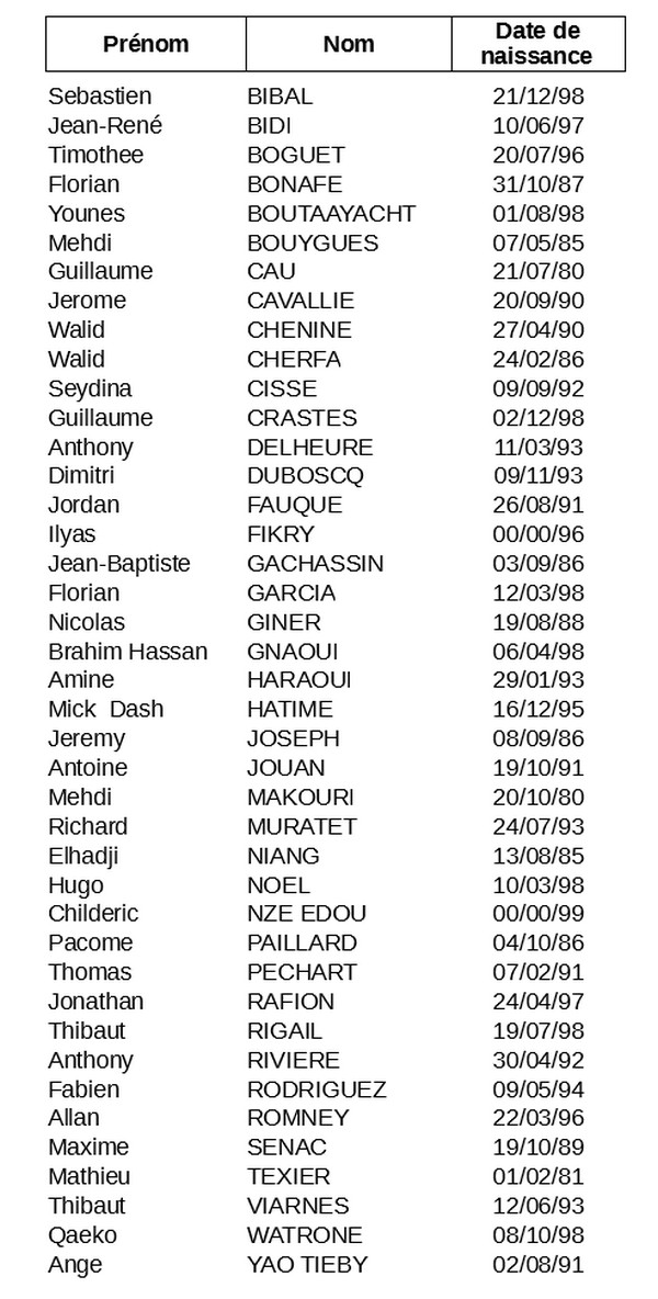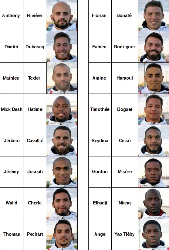 Le groupe sélectionné par Fabrice Dubois : Rivière – Duboscq – Texier – Hatime – Cavallié – Joseph – Cherfa – Pechart – Bonafé – Rodriguez – Haraoui – Boguet – Cissé – Niang – Misère – Yao