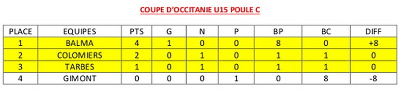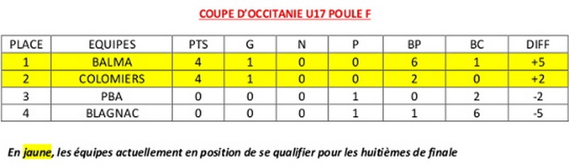Le site Footpy a fait le classement des 6 groupes en U15 et en U17 après la première journée de la Coupe d’Occitanie. Ci-dessous les deux groupes qui concernent nos équipes.