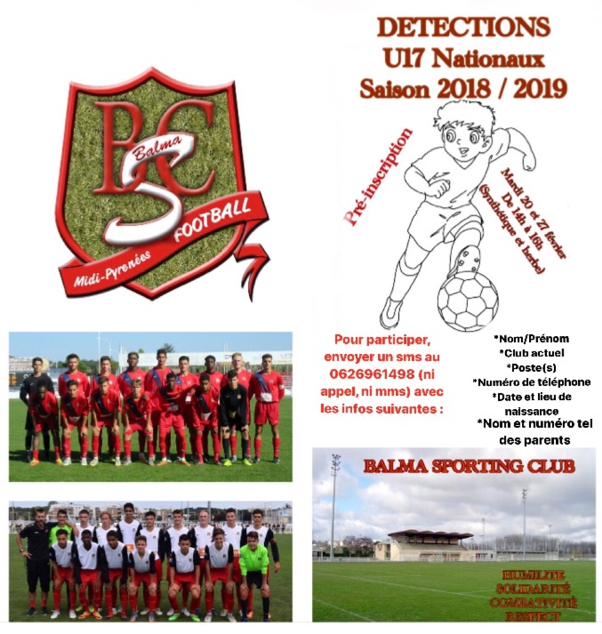 Les détections pour intégrer l’équipe des U17 nationaux la saison prochaine sont programmées aux mardis 20 et 27 février de 14h à 16h sur le terrain synthétique.
