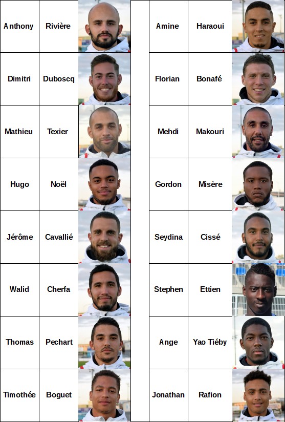 La liste des joueurs retenus : Rivière – Dubosq – Texier – Noël – Cavallié – Cherfa – Pechart – Boguet – Haraoui – Bonafé – Makouri – Misère – Cissé – Ettien – Yao Tieby – Rafion.
