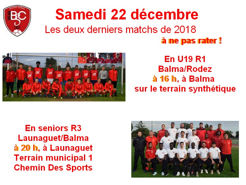 Deux équipes ont des matchs en retard à jouer. Deux équipes actuellement premières de leur groupe en championnat. Ces deux derniers matchs de l’année 2018 sont donc très importants. Alors, pourquoi pas un dernier match pour vous aussi amis du Balma SC ?