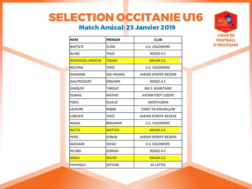 Félicitations à trois U16 balmanais : Tomas Boumaiza Laroche, Matteo Natta et Mahdi Sebaa sélectionné par la Ligue Occitanie pour disputer un match amical le 23 janvier contre le Toulouse FC .
