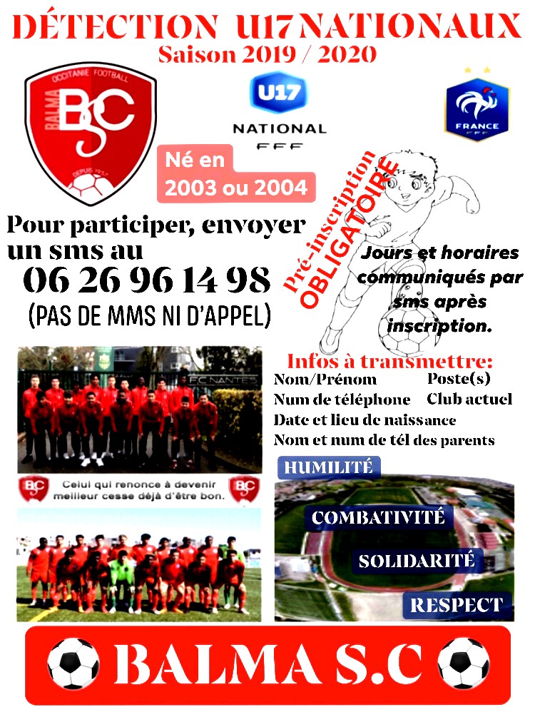 Pour pouvoir participer aux détections des U17 nationaux, une pré-inscription par SMS uniquement au 06-26-96-14-98 est obligatoire.