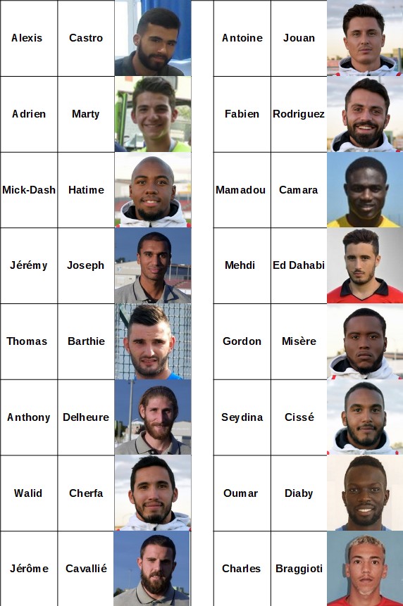La liste et le trombinoscope des joueurs retenus par le coach : Castro – Marty – Hatime – Joseph – Barthié – Delheure – Cherfa – Cavallié – Jouan – Rodriguez – Camara – Ed Dahabi – Misère – Cissé – Diaby – Bragiotti