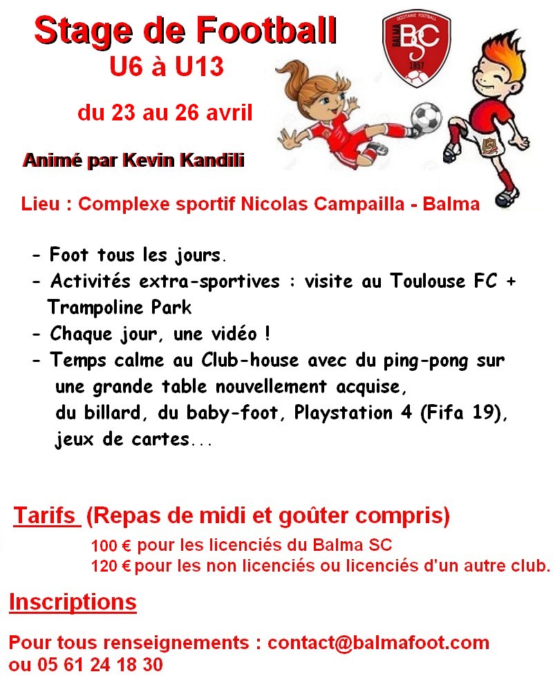 Les vacances de printemps approchent. Les jours rallongent, le temps s’améliore (en principe… et en tout cas, la pluie, s’il y en a, devient plus chaude). Alors pourquoi ne pas occuper agréablement et utilement une partie de vos vacances en participant au stage de foot organisé par le Balma SC ?