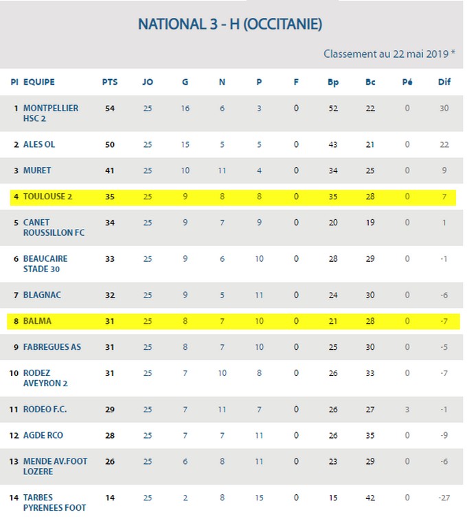 Le classement du groupe de national3 « Occitanie » (source fff) avant la dernière journée. Montpellier est d’ores et déjà champion et Tarbes relégué en R1. Verdict samedi prochain pour les deux autres relégués : Mende, Agde, Toulouse Rodéo, Fabrègues, Rodez2, Balma ?