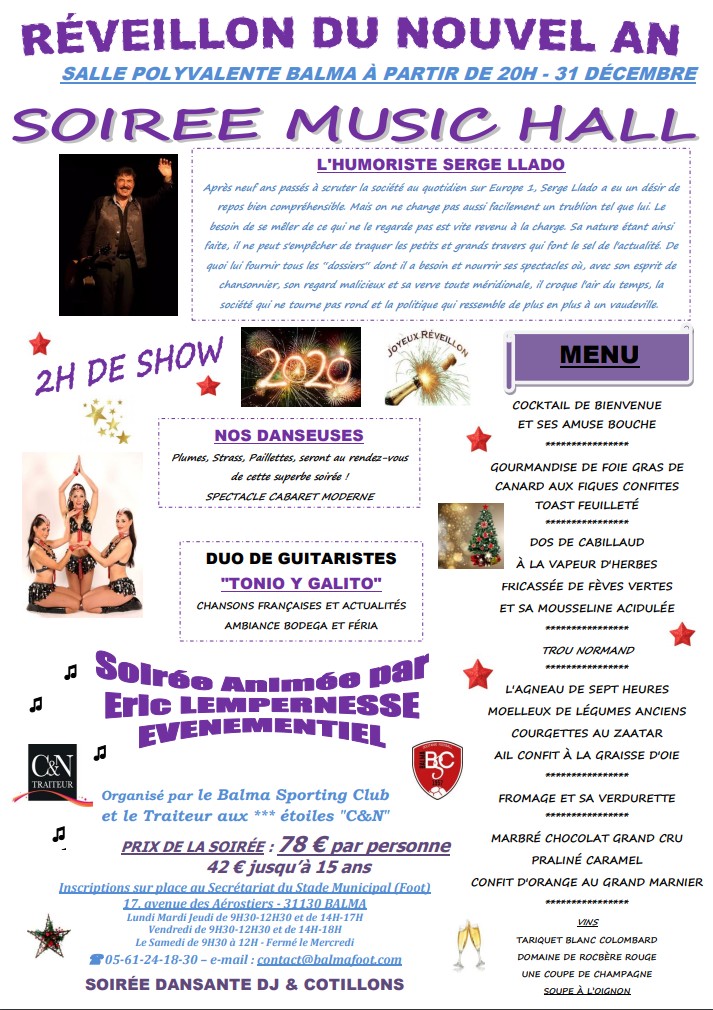 Ambiance « Music Hall » au réveillon de la Saint Sylvestre du Balma SC cette année. Plumes, paillettes, charme, humour… sont au programme. Vous apprécierez c’est sûr, la qualité des numéros du spectacle, de l’animation, l’excellent repas dont rien que la lecture du menu vous donnera l’eau à la bouche.