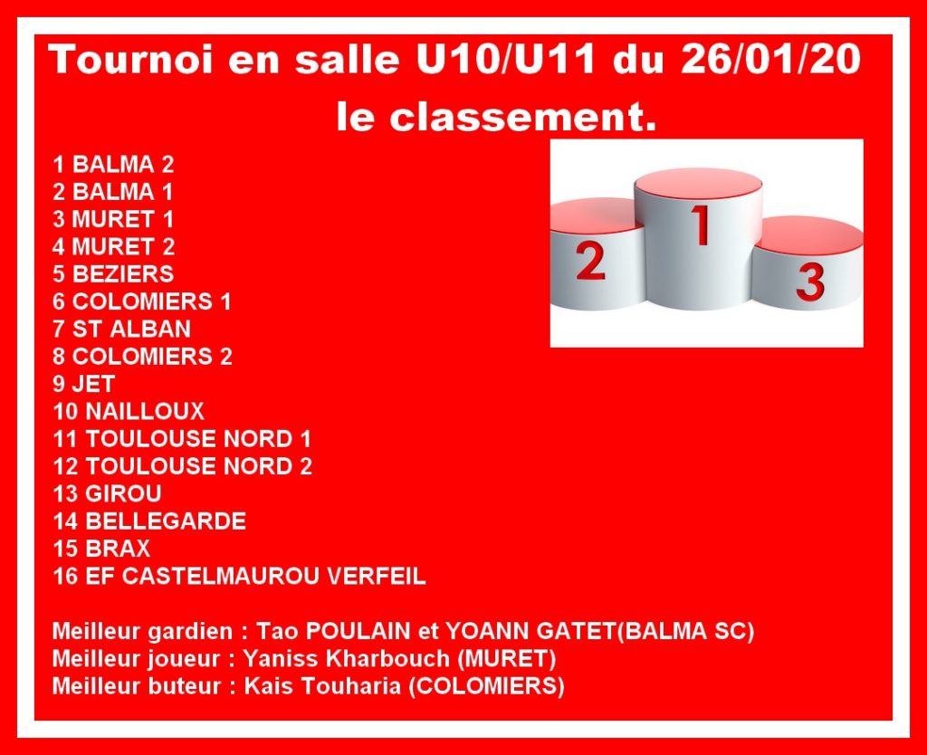 Merci à tous les participants : joueurs, éducateurs, parents, arbitres… qui, par leur présence, leur attitude, leur implication ont permis le bon déroulement de ce premier tournoi en salle de l’année 2020 au Balma SC.