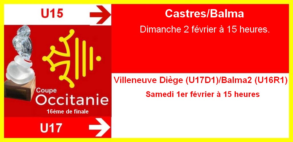– Les U15 se déplaceront à Castres pour les seizièmes de finale de la coupe d’Occitanie.