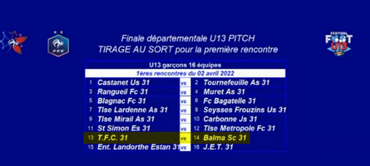 Ci-dessous le tirage au sort du premier match qui pour Balma aura lieu à 10 h 30 contre le TFC.