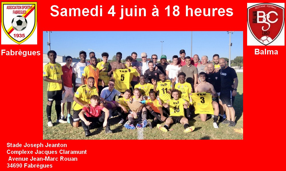 Pour le dernier match du championnat de la saison, les Balmanais se rendront à Fabrègues. Sur la photo ci-dessus, vous pouvez voir l’équipe victorieuse (4-0) après son dernier match à domicile contre Muret. Cette ultime confrontation sera sans enjeu pour les deux équipes. Sébastien Mignotte, son staff et ses joueurs étant assurés de jouer en national3 la saison prochaine alors que l’issue du championnat est moins enviable pour nos adversaires déjà relégués en R1.