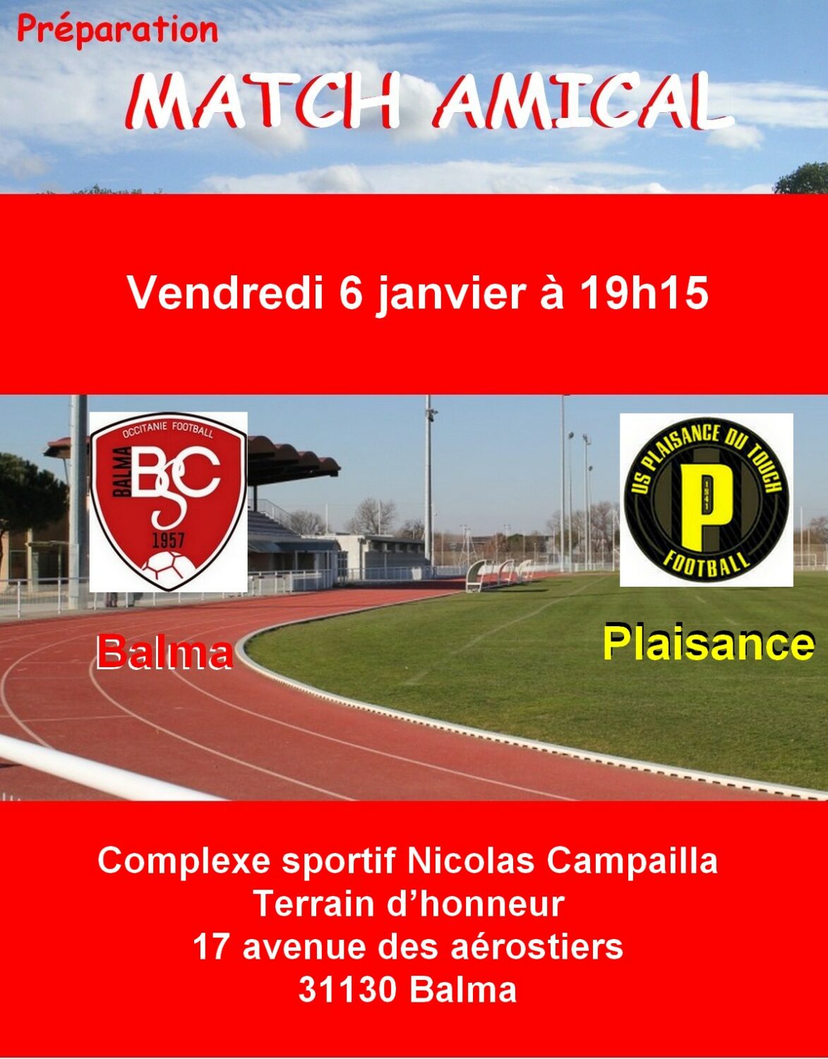 Match amical pour les joueurs de la N3 ce vendredi à Balma contre Plaisance, club de R1 à partir de 19h15. Ce match permettra de préparer le prochain match de championnat qui aura lieu la semaine prochaine avec la réception d’Aigues Mortes.