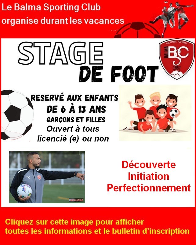 Les «grandes» vacances approchent à grands pas. La saison footballistique se termine et avant le début de la prochaine, certains d’entre vous auront sûrement envie de pratiquer ce sport qui nous réunit tous : le football. Cela tombe bien, le Balma SC organise quatre semaines de stage réparties sur la période de vacances afin que chacun puisse choisir la période qui lui convient.