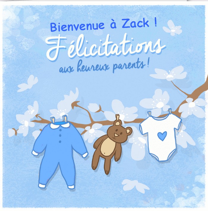 Cette nuit, à 4h30, un petit garçon de 3,330 kg et d’un petit peu plus de 50 cm prénommé Zack, a pointé le bout de son nez pour la plus grande joie de ses heureux parents.