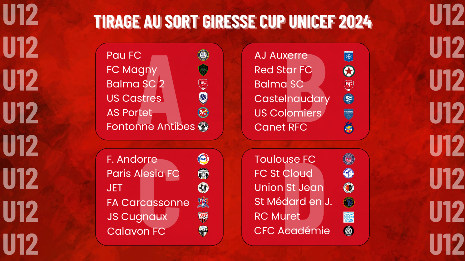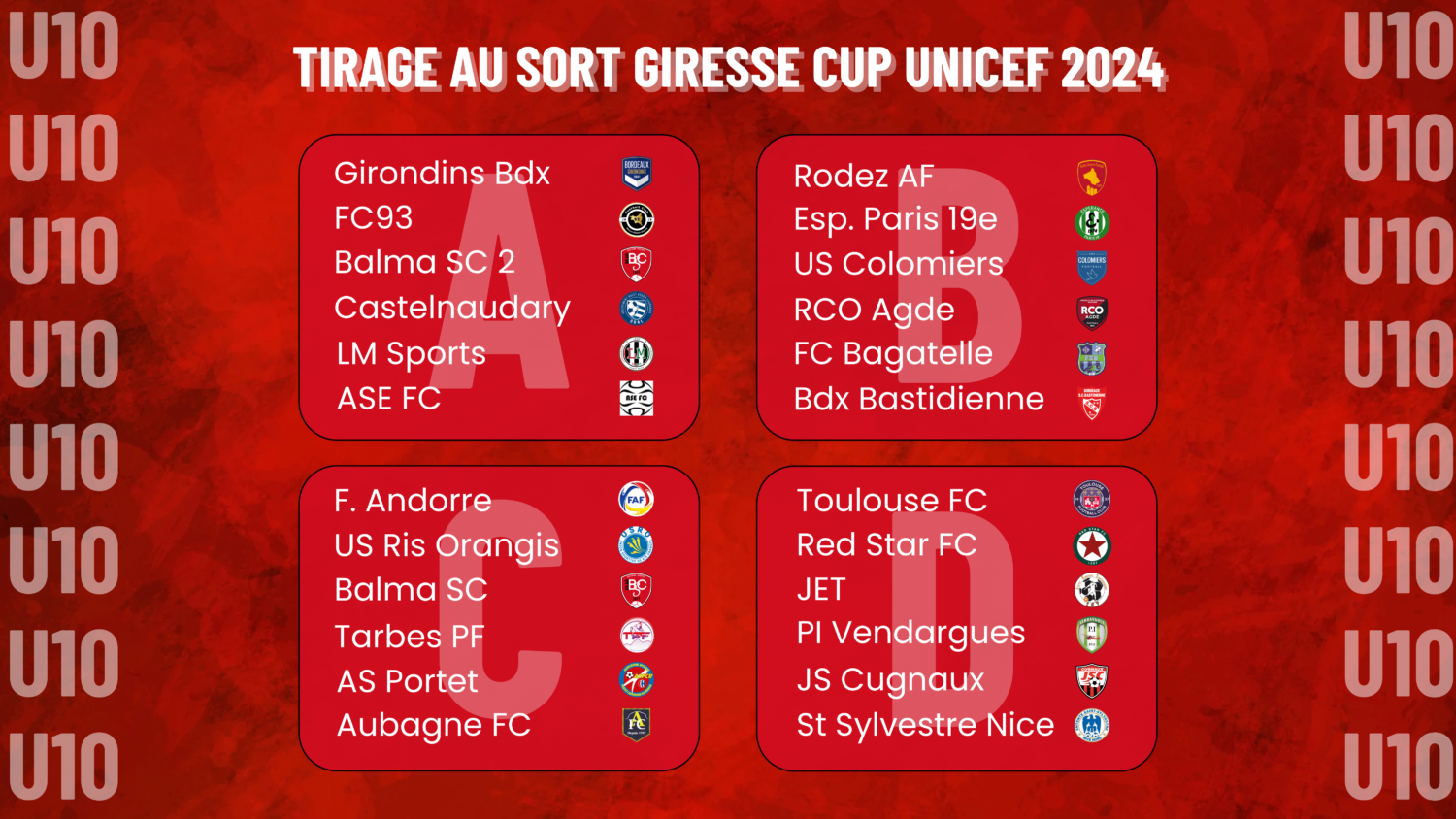 Suite au tirage au sort réalisé en live sur nos réseaux sociaux avec nos invités d’exception, découvrez les 4 poules de 6 équipes pour le tournoi U10 et pour celui des U12 de la Giresse Cup Unicef 2024 ! 🔴⚪️🏆