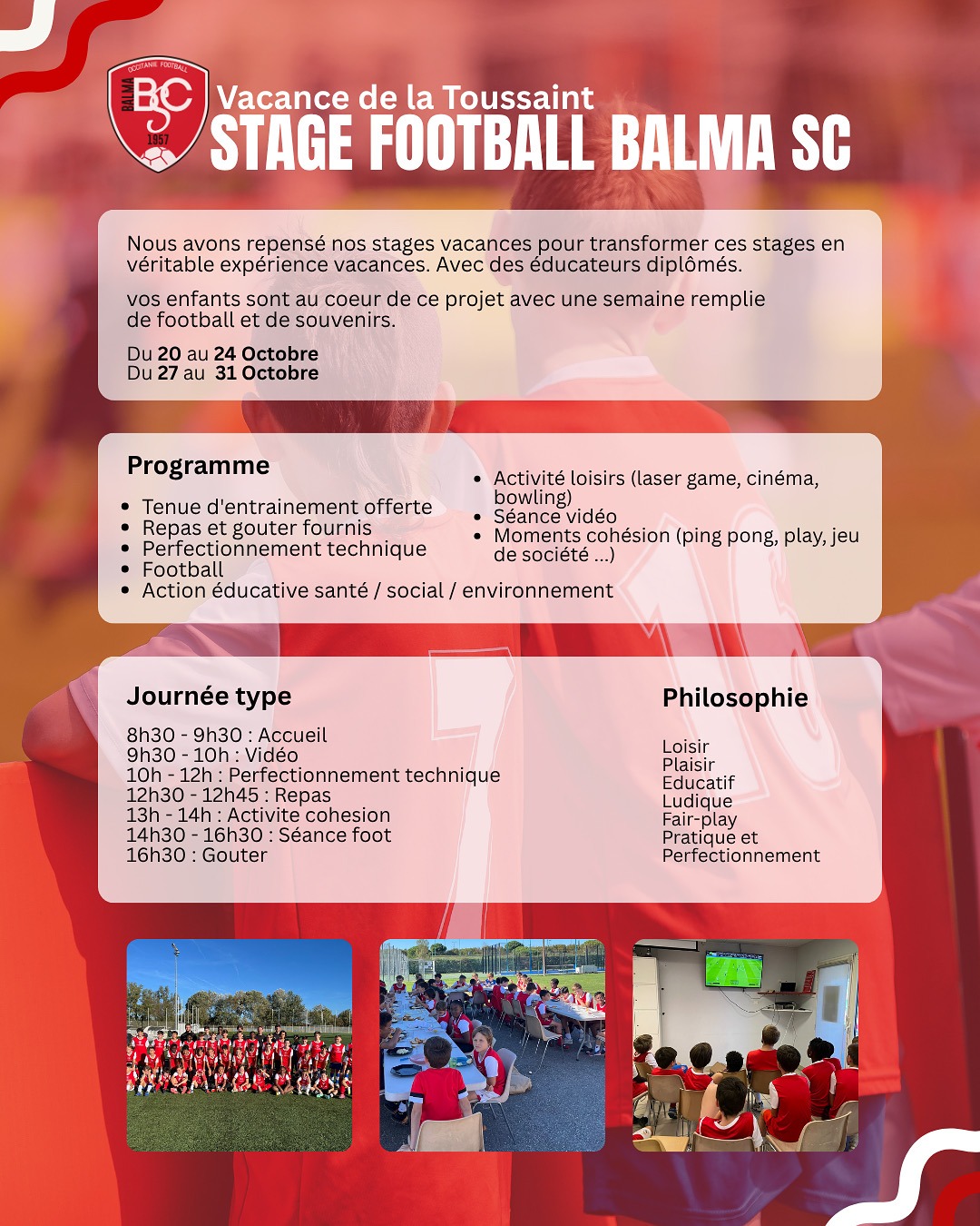 Rendez-vous sur les deux dernières semaines du mois d’Octobre pour venir aux stages vacances organisés par le Balma SC avec au programme du football, des séances de perfectionnement mais aussi des activités et des supers moments de cohésion !