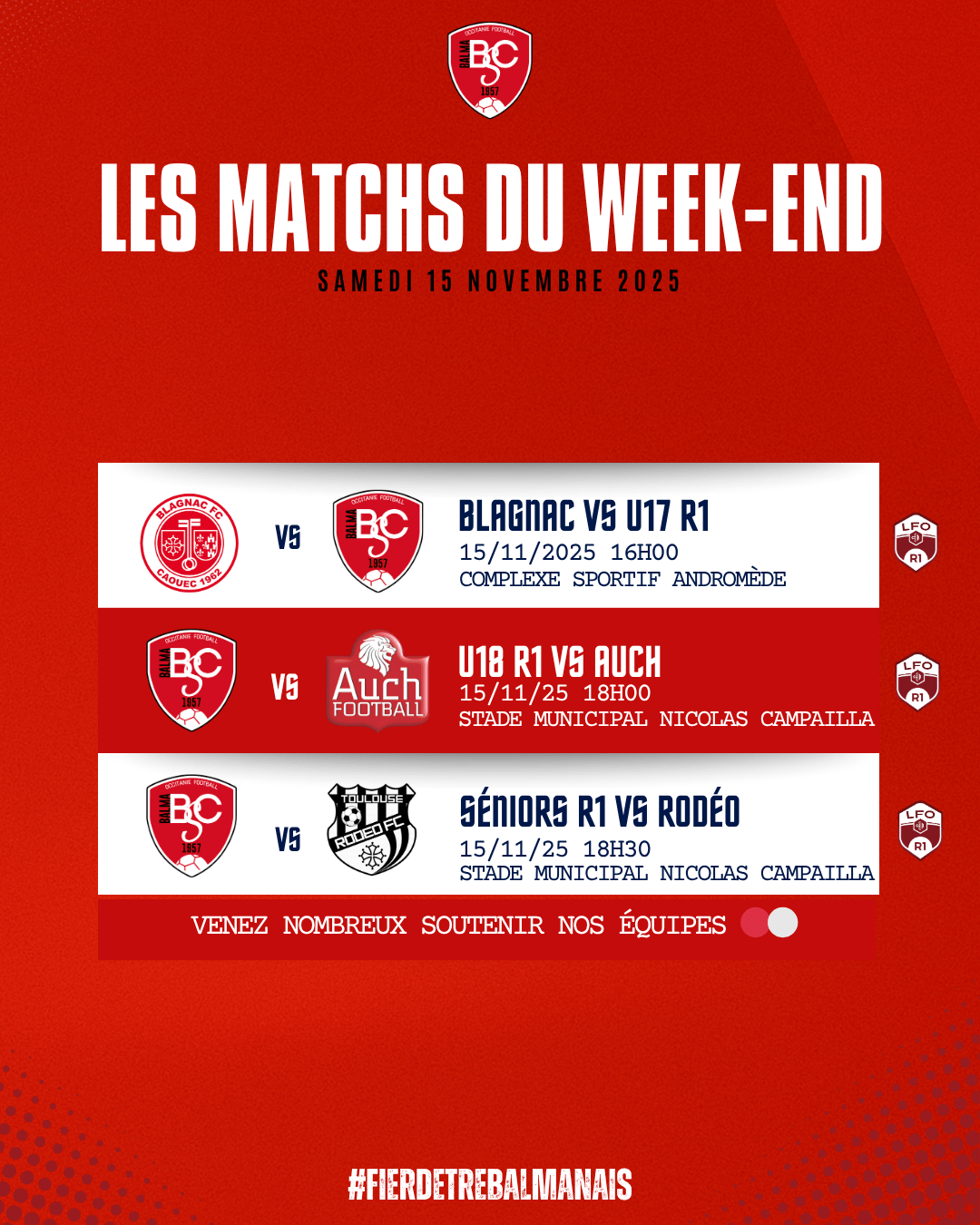 Du U14 aux Séniors, nos équipes sont prêtes à mouiller le maillot, à domicile comme à l’extérieur, ce samedi 15 et dimanche 16 novembre.