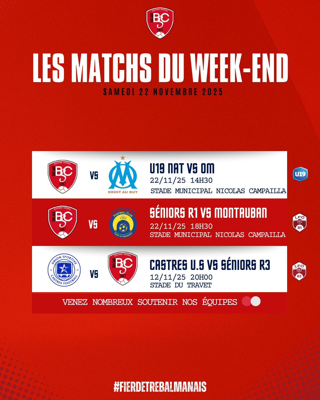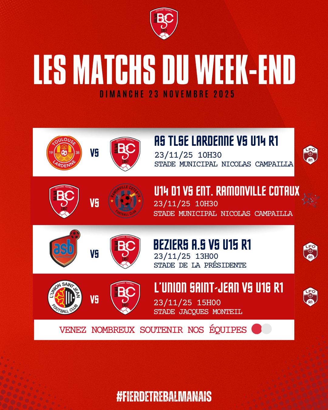 Nos équipes du Balma SC seront sur les terrains samedi et dimanche pour un programme chargé : U14, U15, U16, U19 mais aussi nos Séniors seront à l’œuvre.