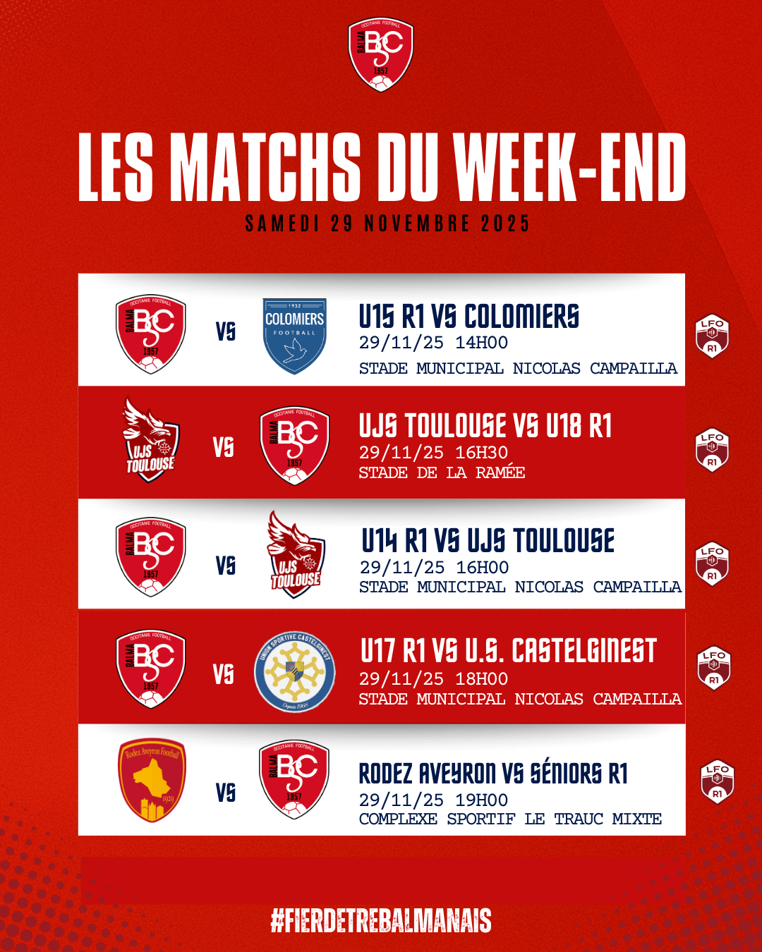 Ce samedi 29 et dimanche 30 novembre 2025, nos équipes balmanaises sont sur tous les fronts ! Des U14 aux Seniors, en passant par nos équipes R1, R3, D1 et National, le club vous propose un programme riche et intense.