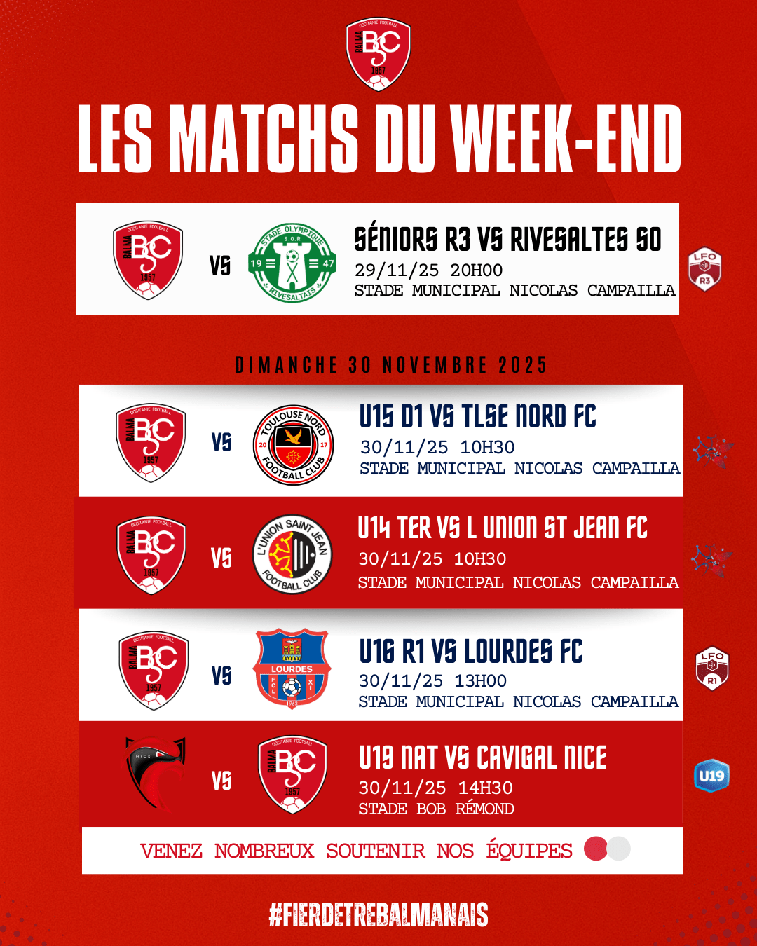 Venez nombreux encourager nos joueurs tout au long du week-end et montrer votre soutien aux couleurs balmanaises.