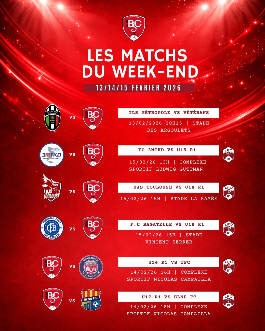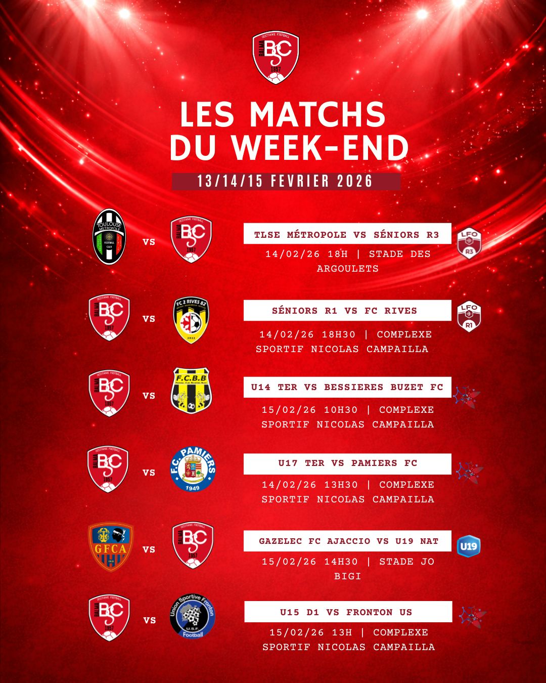 Nos équipes sont sur les terrains du 13 au 15 février. Venez nombreux les soutenir et porter haut les couleurs du club. ❤️🤍