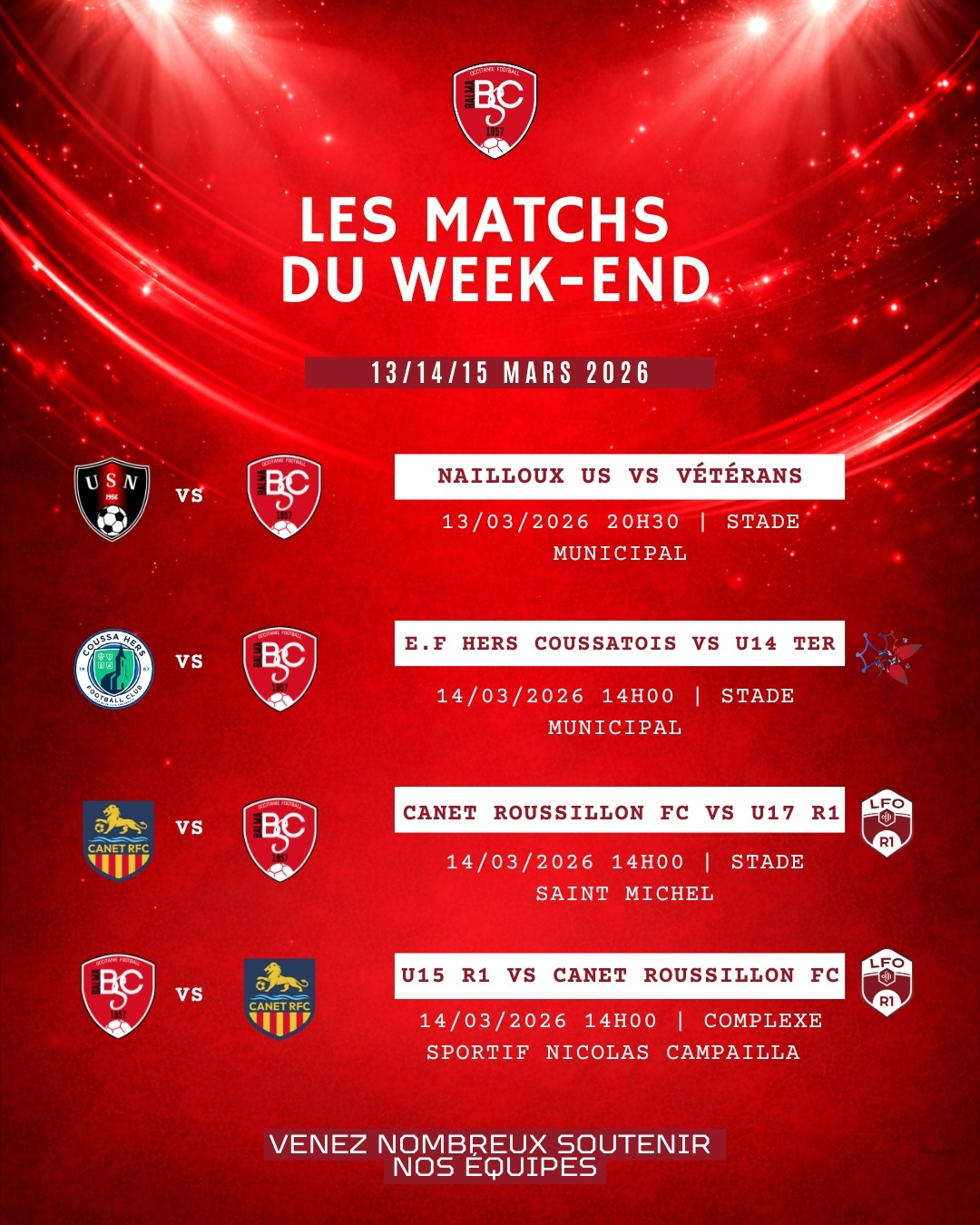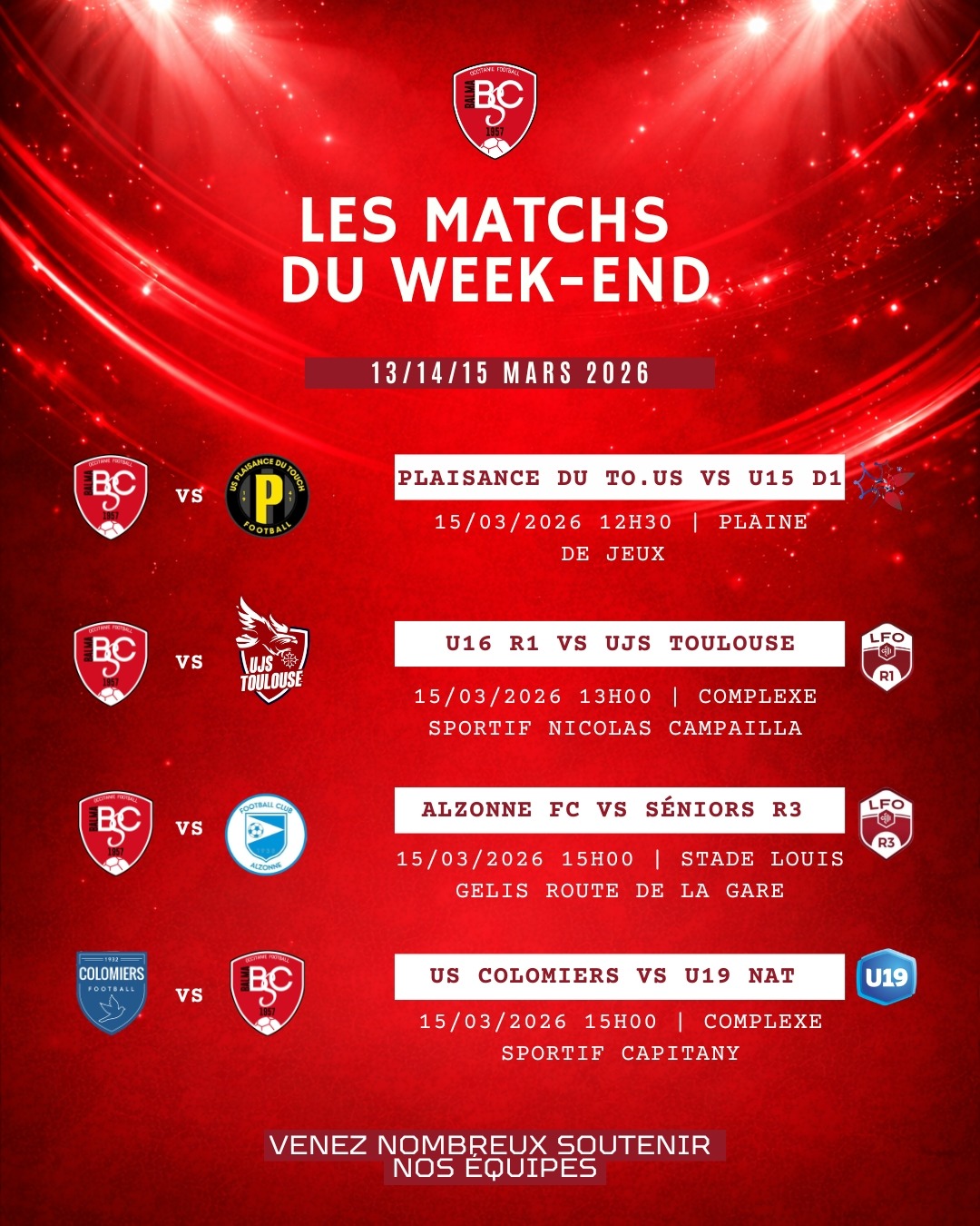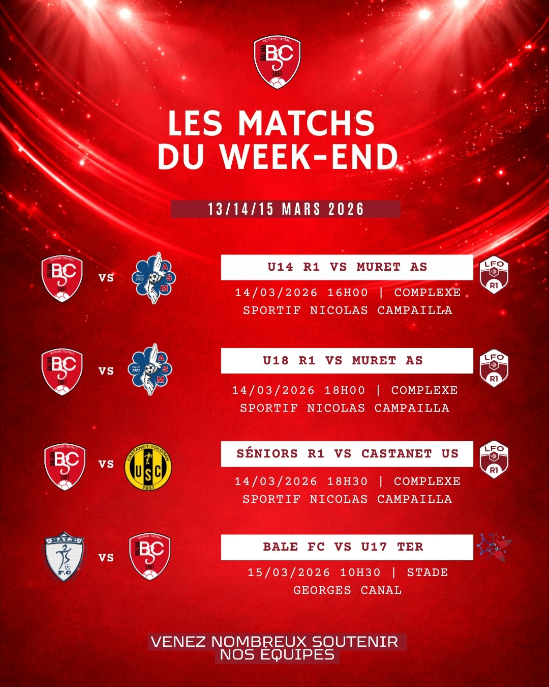Nos équipes seront sur les terrains ce 13, 14 et 15 mars 2026. Venez nombreux encourager et soutenir nos joueurs tout au long du week-end ! 🔴⚪